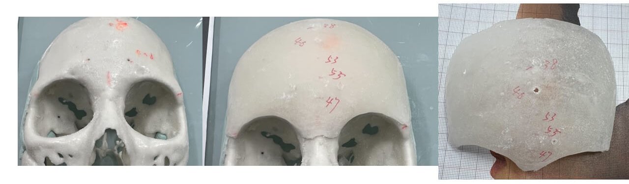 3D矽膠提供很好的人體組織結合度,減少術後排斥,且可依照患者額頭進行客製化雕塑,術後效果較為自然。人工骨則是一種骨科經常使用的骨填充物,可用於骨折或人工關節置換手術時填補空隙,與骨質親和力及密合度高,整形外科則使用高稠度骨水泥去模擬硬骨組織,其可塑性高的特性讓醫師可以完全客製化理想的額頭形狀。