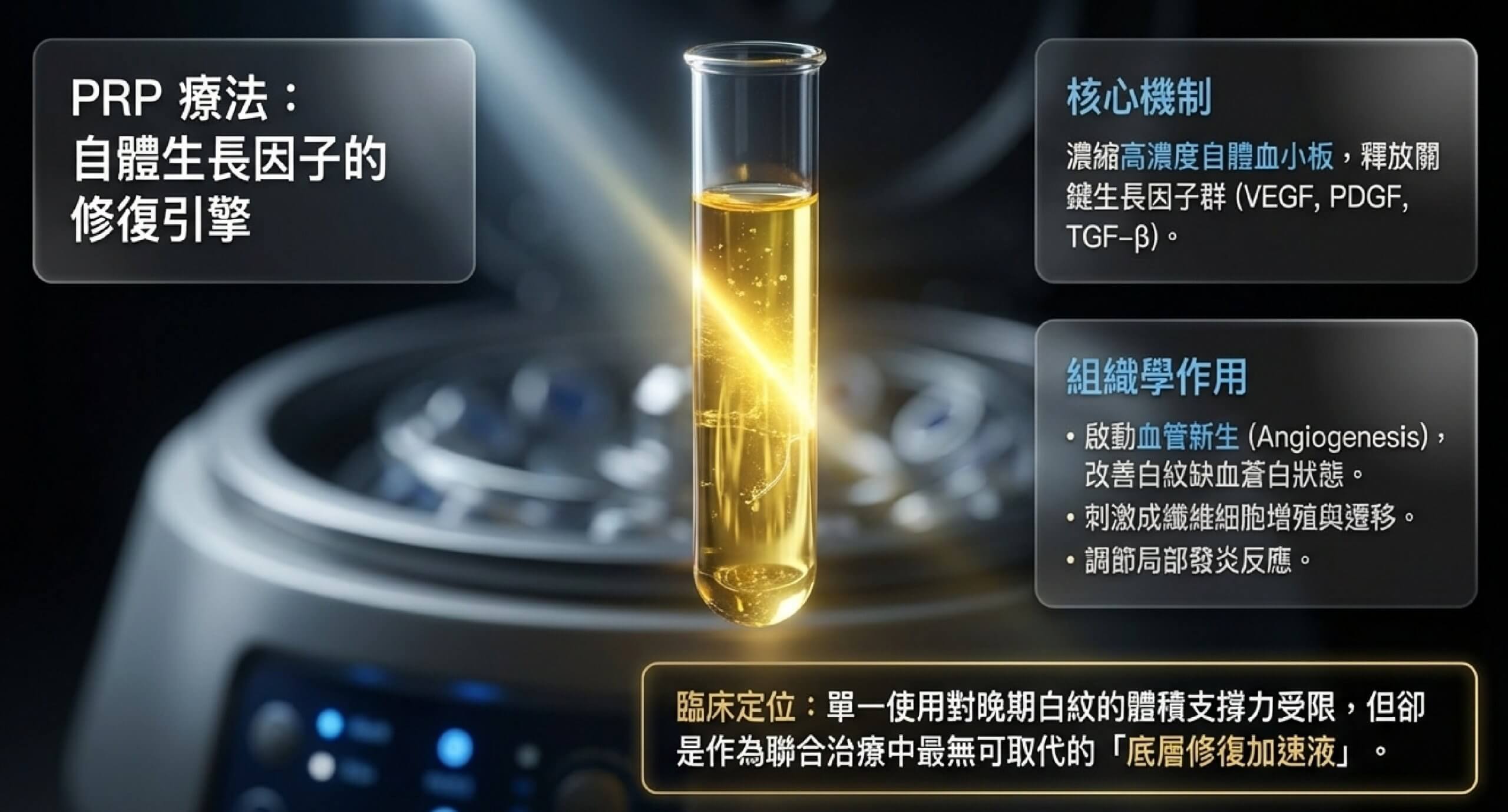 透過雙重離心法從自體血液中分離,血小板濃度需達到基礎值的 4 倍以上。臨床建議在注射前加入氯化鈣進行活化,以觸發細胞激素的釋放。作為聯合治療中無可取代的「底層修復加速液」,有助於啟動血管新生。