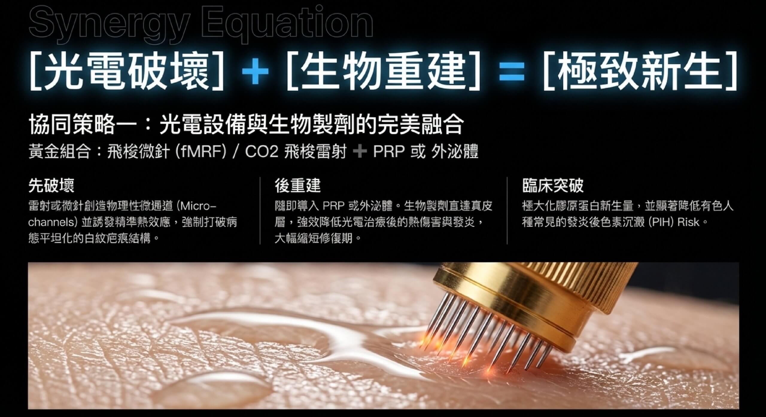 - 生物重建:再生因子(外泌體或PRP)順著微通道進入深層組織,負責生化性的修復與建構。