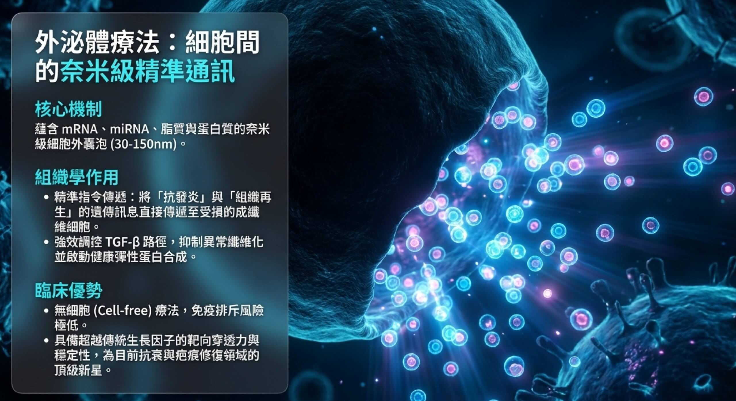 外泌體為直徑 30-150 奈米的細胞外囊泡,含有超過 400 種生長因子。作為細胞間的訊號傳遞者,外泌體具備獨特的抗發炎特性,能精確誘導第一型與第三型膠原蛋白的合成。在修復速度上具絕對優勢,初步改善效果通常在 3 天內即可觀察到。