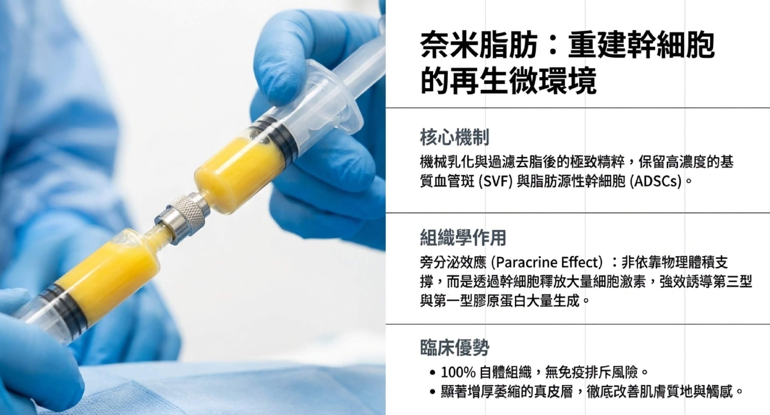 透過機械處理脂肪組織獲得脂肪來源幹細胞與血管基質層 (SVF),此類細胞在組織修復中擔任調節者,能引導受損區域的微環境重建,顯著增厚萎縮的真皮層。
