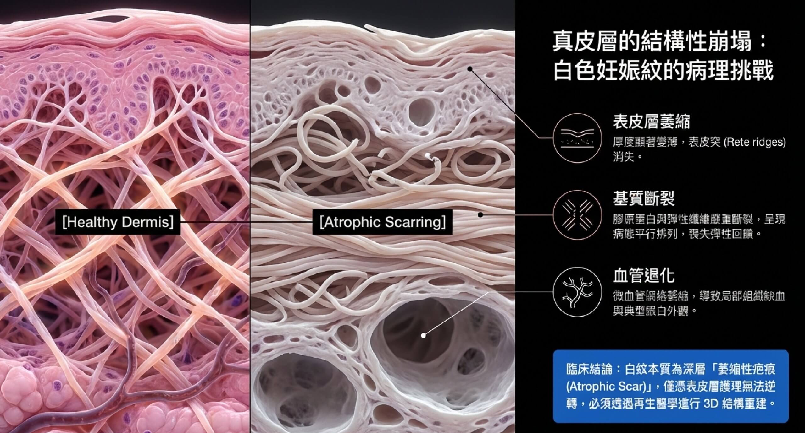 在初始階段(紅色妊娠紋),真皮層呈現微血管擴張與發炎反應。隨著癒合過程推進,血管逐漸閉鎖消失,取而代之的是萎縮性纖維組織。最終階段即為白色妊娠紋,呈現銀白色、扁平或微凹陷的特徵,其本質為一種成熟的萎縮性疤痕。