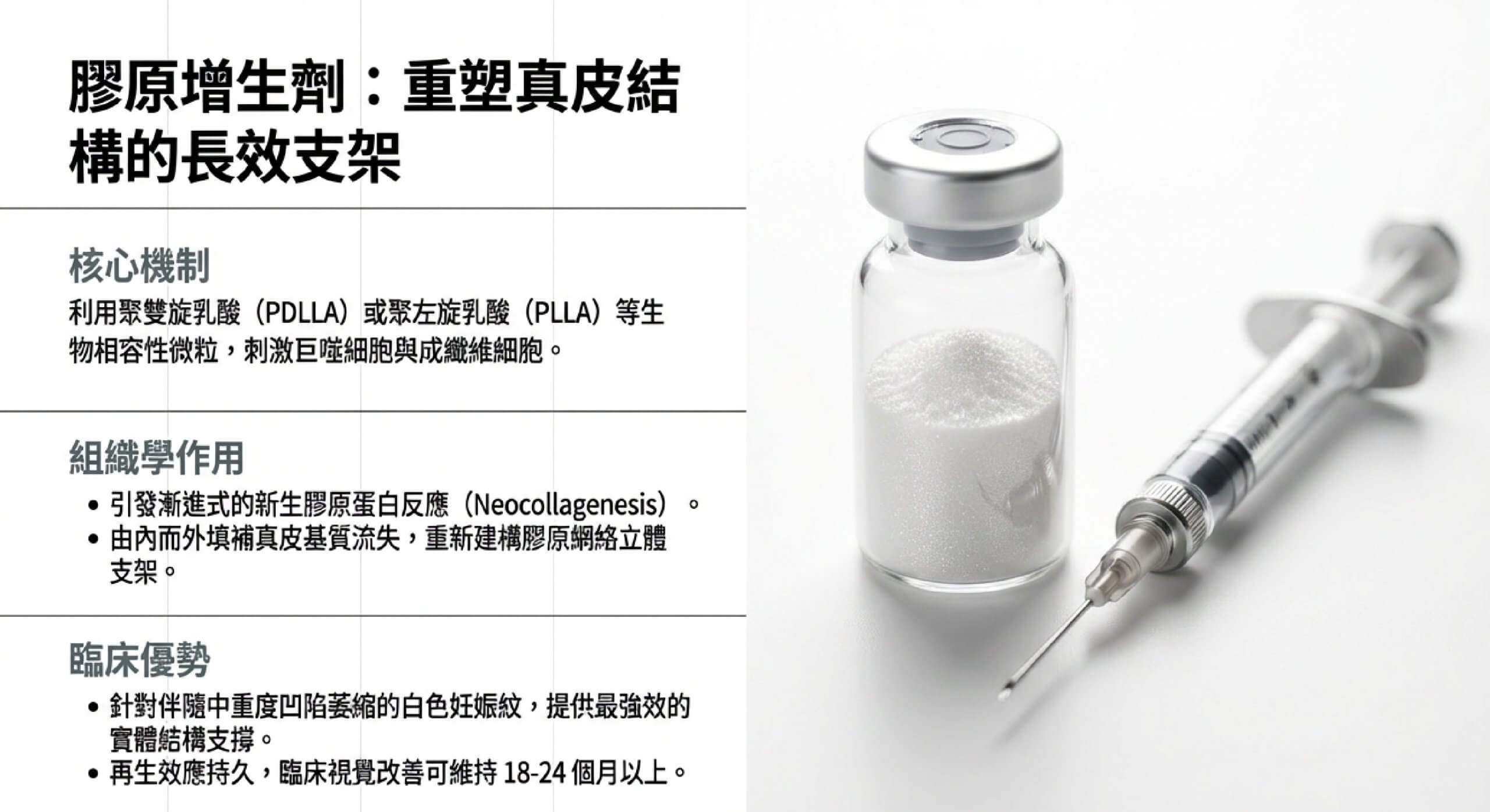 膠原蛋白增生劑如聚雙旋乳酸(PDLLA,如 AestheFill)其作用並非單純物理性填充,而是引導組織新生。注入真皮深層後充當支架,誘發微量異物反應,激活纖維母細胞分泌天然膠原蛋白,強化真皮層密度。新生膠原蛋白結構穩定,療效通常可維持 12 至 24 個月。